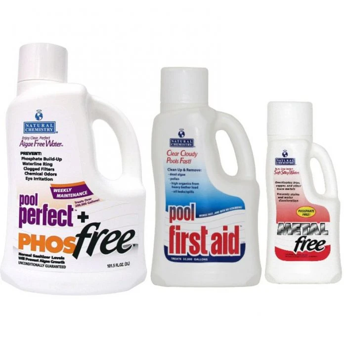 Natural Chemistry’s Pro Bundle contains a 3L bottle of Pool Perfect + PHOSfree, 2L bottle of Pool First Aid, and a 1L bottle of METALfree.